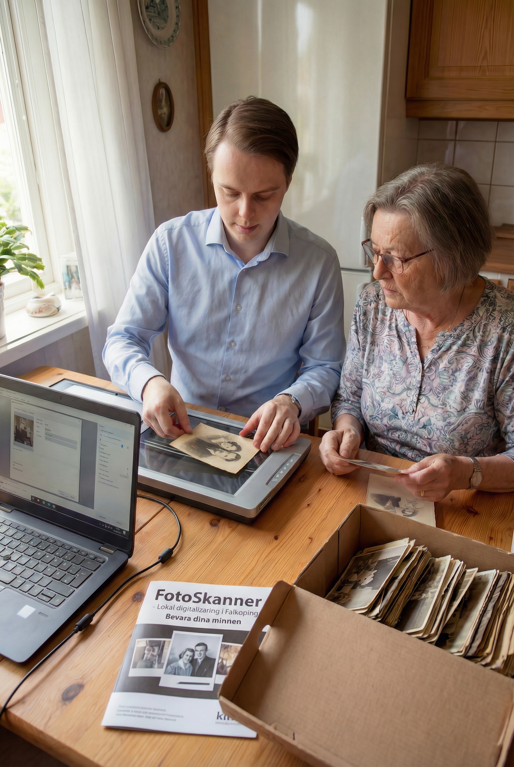 Vi kommer hem till dig med all utrustning. Du sitter bekvämt i din soffa medan vi skannar – och fotona lämnar aldrig ditt hem. Perfekt för dig som vill vara nära sina minnen under hela processen.